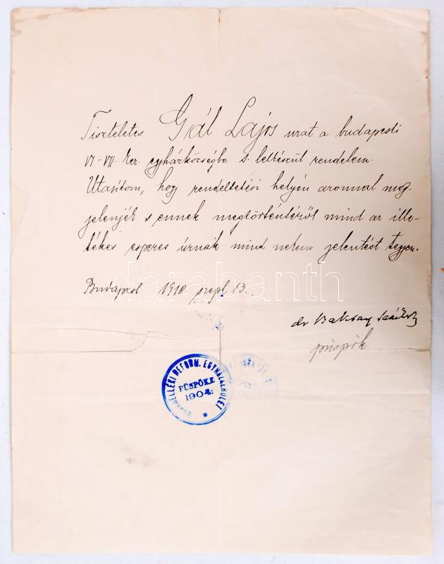 Beschreibung: 1910 Dr Baksay Sándor református püspök levele.