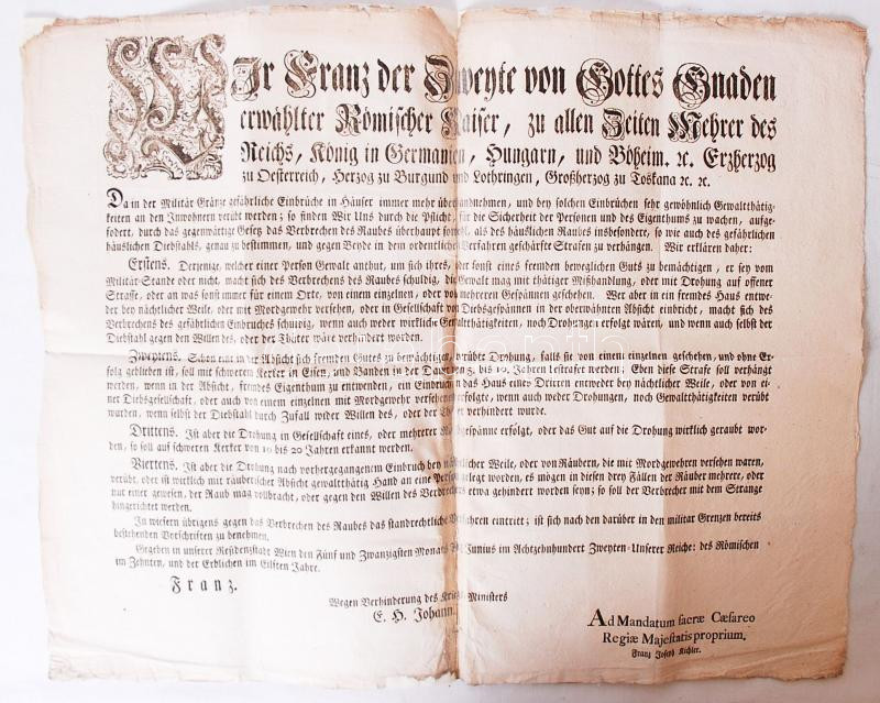 1802 I. Ferenc császár rendelete a Katonai Határörvídéken elszaporodott betörések és erőszakos cselekmények megállítására / Order for the Miltary-Border territory against robberies 53x43 cm