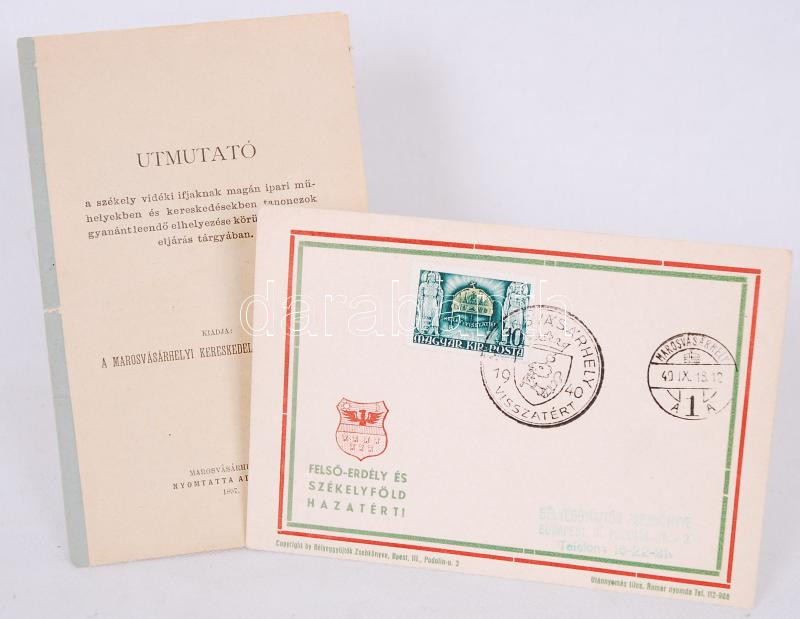 Beschreibung: 1897/1940 Emléklap "Marosvásárhely visszatért 1940" alkalmi bélyegzéssel; valamint: Utmutató a székely vidéki ifjaknak magán ipari műhelyekben és kereskedésekben tanonczok gyanánt leendő elhelyezése körül követendő eljárás tárgyában. Marosvásárhely 1897, Marosvásárhelyi Kereskedelmi és Iparkamara, 7p.