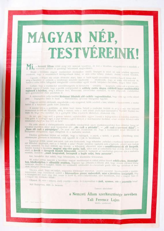 1909 Szociáldemokrata-ellenes plakát a Nemzeti Állam c. újság újságíró... https://www.darabanth.com/de/175-Fernauktion/175.0/Andere-Sammelgebiete/Drucksachen~1000044/1909-Szocialdemokrata-ellenes-plakat-a-Nemzeti-Allam-c-ujsag-ujsagiroitol-40x60-cm~II605809