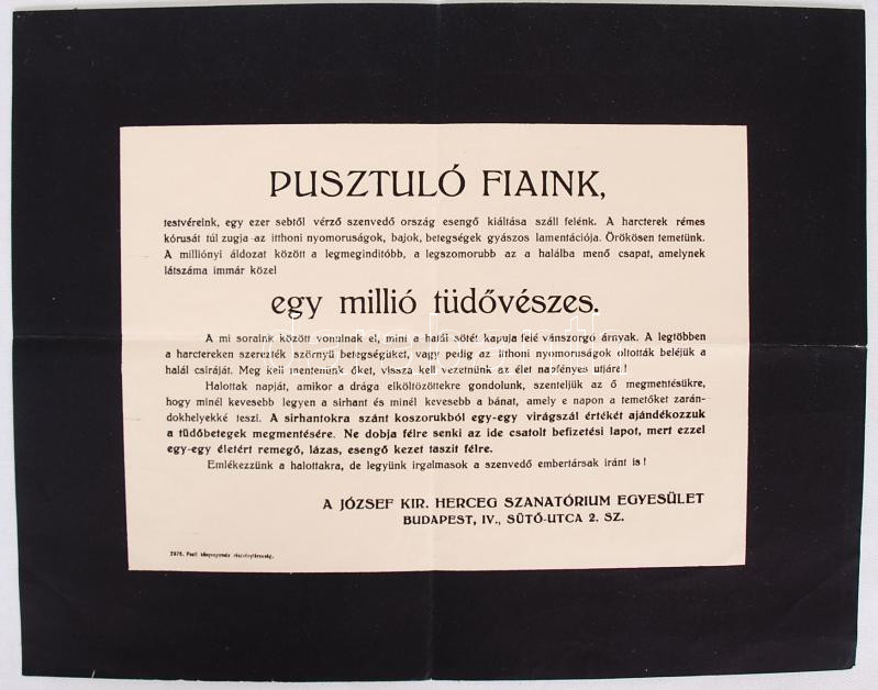 cca 1920 Tüdővészesek gyászjelentés formájú felhívás https://www.darabanth.com/de/175-Fernauktion/175.0/Andere-Sammelgebiete/Drucksachen~1000044/cca-1920-Tudoveszesek-gyaszjelentes-formaju-felhivas~II607092