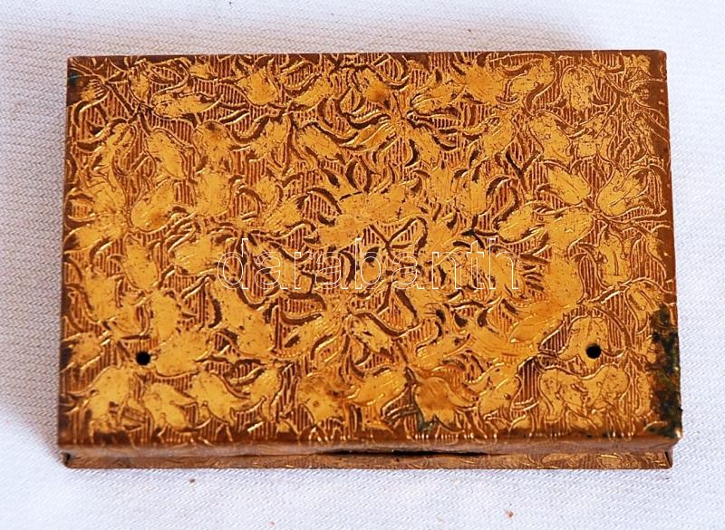 Beschreibung: Aranyozott fém szelence, virág díszítéssel, kopott, 5×7 cm