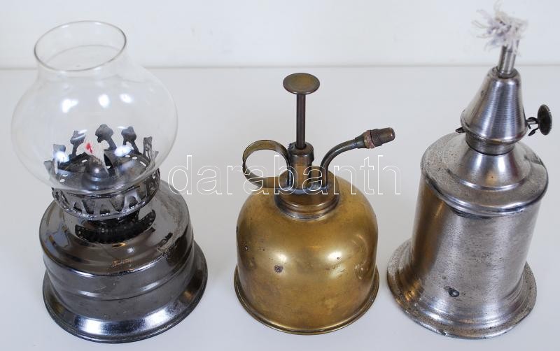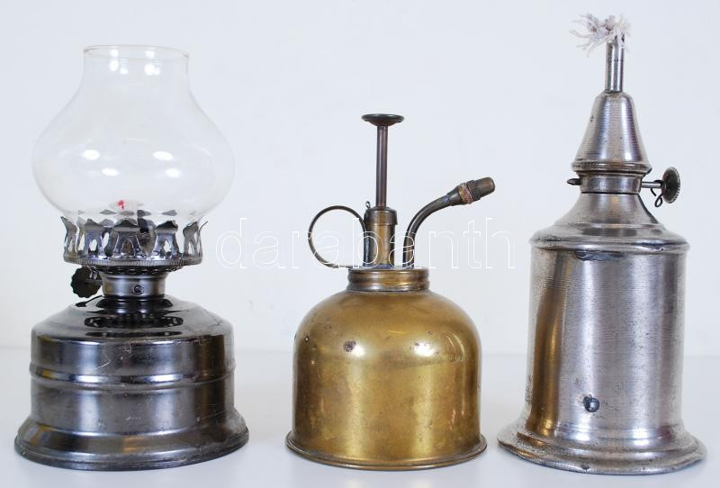Beschreibung: Kis bolha tétel: La Fauvette reklámos benzin-égő, kis alumínium petróleum lámpa, régi pumpás varrógép-olajozó edény