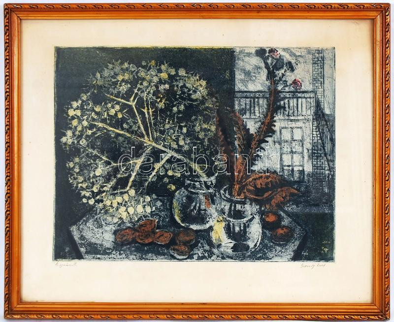 Beschreibung: Breznay József (1916-): Bogáncsok. Rézkarc, papír, jelzett, üvegezett keretben, 42×52 cm
