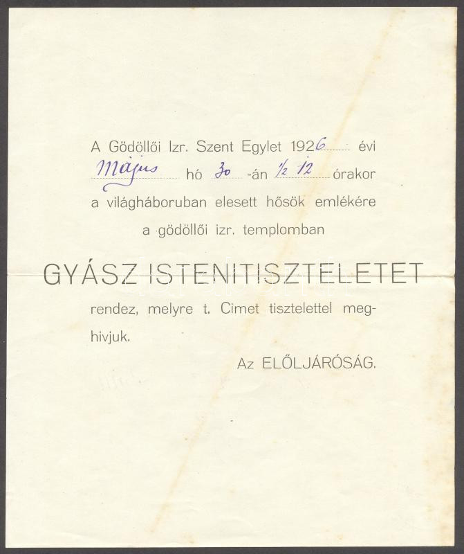 Beschreibung: 1926 A Gödöllői Izraelita Szent Egylet világháborús emlék-istentisztelete meghívó