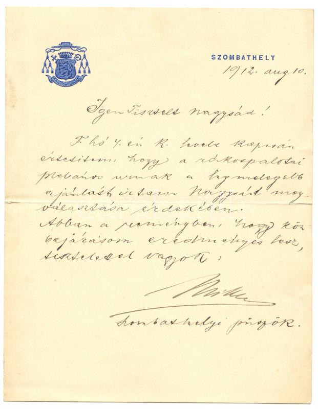 Beschreibung: 1912 gróf zabolai Mikes János szombathelyi püspök saját kézzel aláírt levele