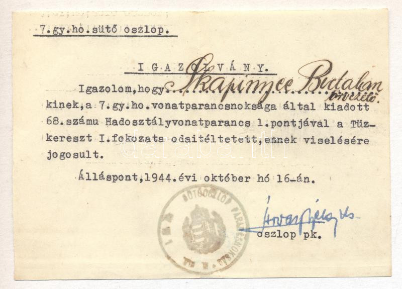 Beschreibung: 1944. Igazolvány a Tűzkereszt I. fokozatának odaítéléséről és viselésének jogosultságáról