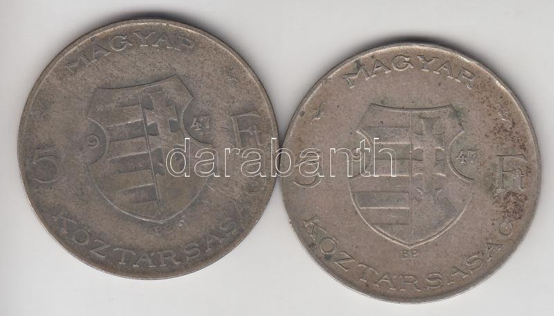 1947. 5Ft Ag "Kossuth" (2x) T:3 https://www.darabanth.com/de/175-Fernauktion/175.0/Numismatik/Ungarische-Munzen~1200087/1947-5Ft-Ag-Kossuth-2x-T3~II603670