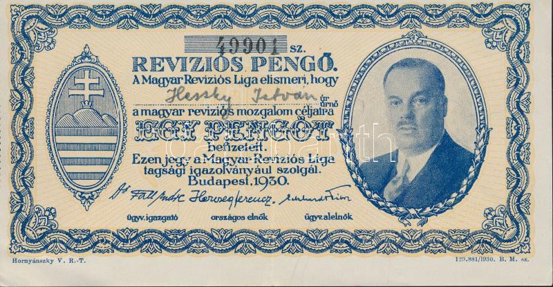 Budapest 1930. "Revíziós Pengő" arcképes változat, kitöltött T:II https://www.darabanth.com/de/175-Fernauktion/175.0/Numismatik/Ungarische-und-Auslandische-Notgelden~1200085/Budapest-1930-Revizios-Pengo-arckepes-valtozat-kitoltott-TII~II606240