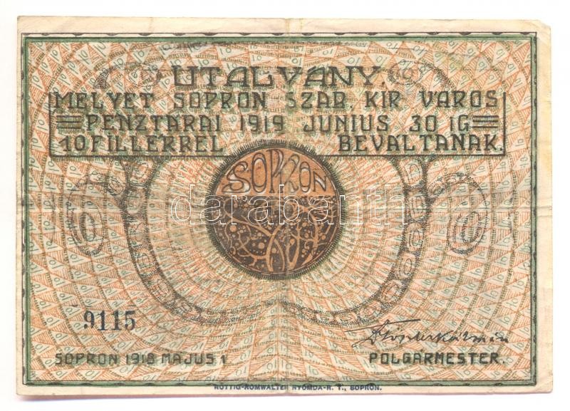 Sopron 1918. 10f utalvány T:III https://www.darabanth.com/de/175-Fernauktion/175.0/Numismatik/Ungarische-und-Auslandische-Notgelden~1200085/Sopron-1918-10f-utalvany-TIII~II605172