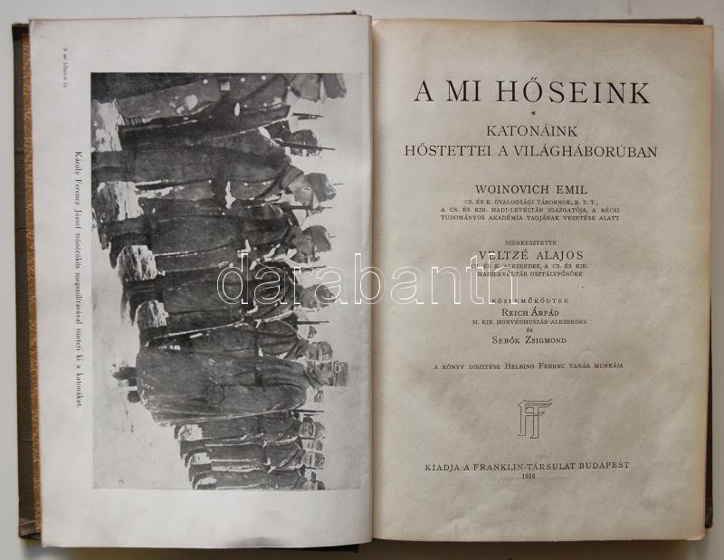 A mi hőseink: Katonák. Woinovich Emil vezetése alatt szerk. Veltzé Alajos. Bp., 1916, Franklin-Társulat. Kidói festett, aranyozott egészvászon kötésben, fotókkal illusztrálva, jó állapotban