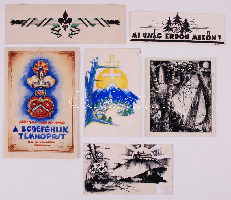 Beschreibung: Bozó Gyula (1913-2004): 6 db képeslap és egyéb terv. vegyes technika