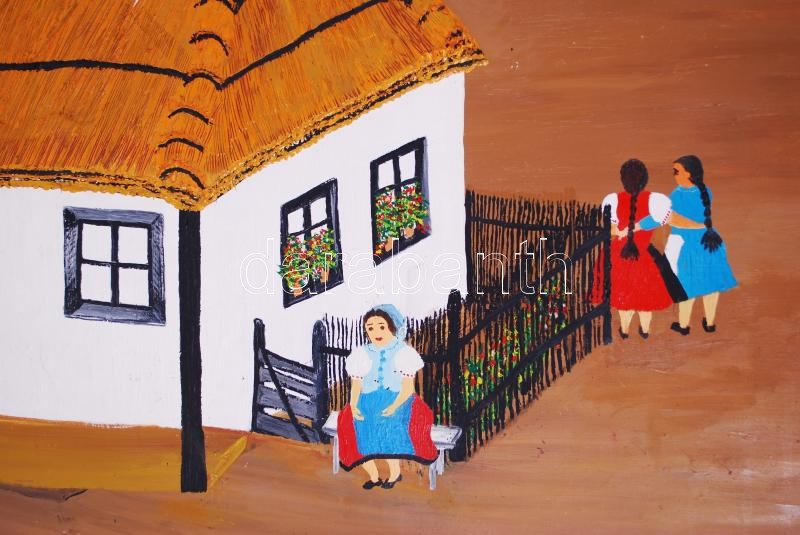 Beschreibung: Eozh jelzéssel: A falusi élet. Naiv festmény. Olaj, vászon, jobb alul kiszakadt (sérült), keretben, 85×105 cm