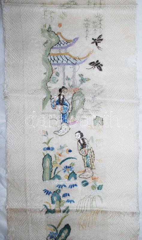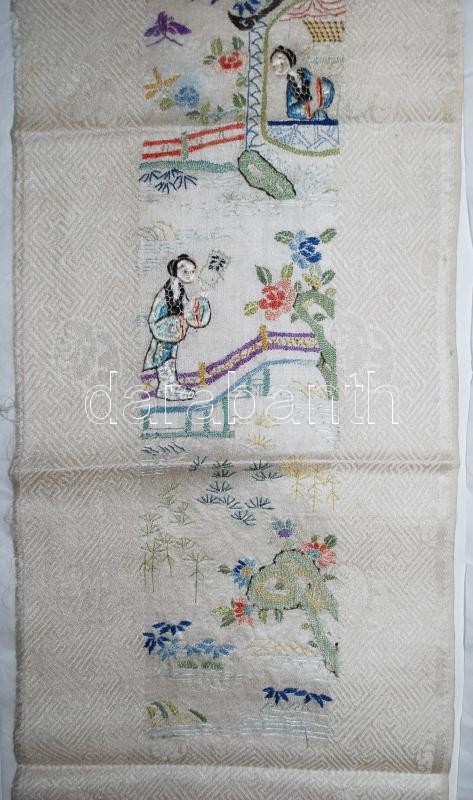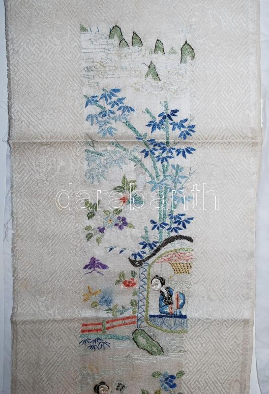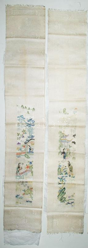 Beschreibung: Cca 1900 vajszínű, anyagában is szövött mintás kínai selyemkép, párban, 104×18 cm/db