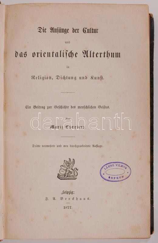 Carriere, Moriz: Die Anfänge der Cultur und das orientalische Alterthum in Religion, Dichtung und Kunst. Leipzig, 1877, Brockhaus, 569p. Félbőr kötés, jó állapot / Half leather