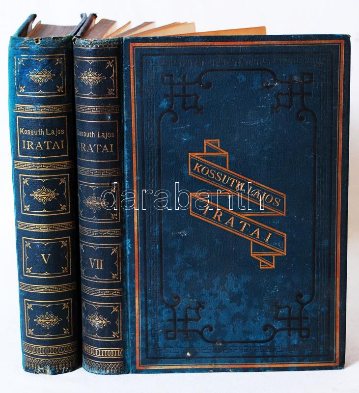 Kossuth Lajos iratai V., VII. kötetek. Komplett. Sajtó alá rendezte Kossuth Ferencz. Bp. 1880-1911. Athenaeum. Aranyozott, festett, dombornyomásos kiadói egészvászon-kötésben. Egyik nagyon laza kötés
