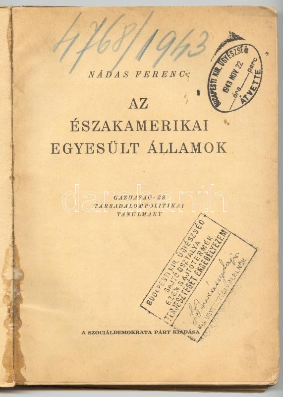 Nádas Ferenc: Usa. Gazdaság- és társadalompolitikai tanulmány. A Szoci... https://www.darabanth.com/de/177-Fernauktion/177.0/Andere-Sammelgebiete/Bucher-Geschichte~200036/Nadas-Ferenc-Usa-Gazdasag-es-tarsadalompolitikai-tanulmany-A-Szocialdemokrata-Part-Kiada~II621452