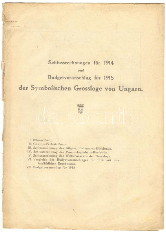 Schlussrechnungen für 1914 und Budgetvoranschlag für 1915 der Symbolis... https://www.darabanth.com/de/177-Fernauktion/177.0/Andere-Sammelgebiete/Bucher-Geschichte~200036/Schlussrechnungen-fur-1914-und-Budgetvoranschlag-fur-1915-der-Symbolischen-Grossloge-von-Ungarn-1~II589570