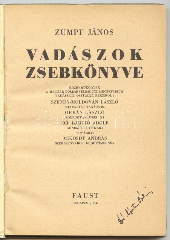Zumpf János: Vadászok zsebkönyve. Budapest 1947. Faust. Táblázatokkal,... https://www.darabanth.com/de/177-Fernauktion/177.0/Andere-Sammelgebiete/Bucher-Jagd~200032/Zumpf-Janos-Vadaszok-zsebkonyve-Budapest-1947-Faust-Tablazatokkal-kepekkel~II622691