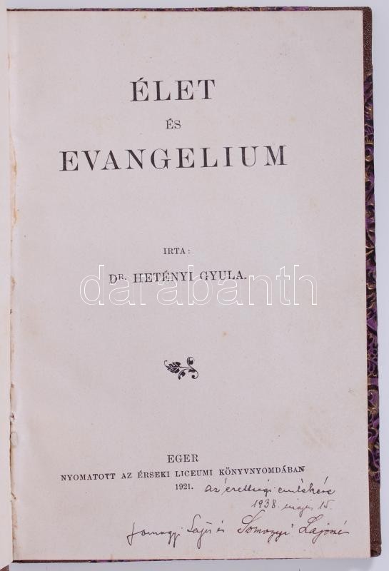 Dr. Hetényi Gyula: Élet és evangélium. Eger 1921. Érseki lyc. https://www.darabanth.com/de/177-Fernauktion/177.0/Andere-Sammelgebiete/Bucher-Religion~200038/Dr-Hetenyi-Gyula-Elet-es-evangelium-Eger-1921-Erseki-lyc~II620160