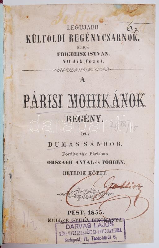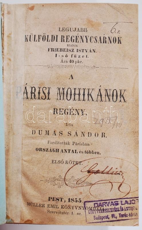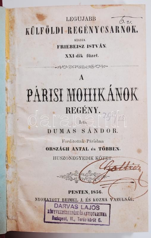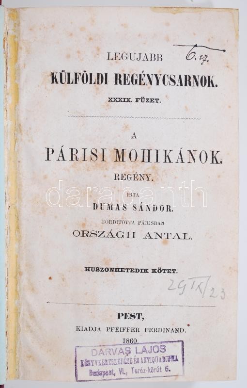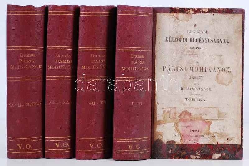 Dumas Sándor: Párisi mohikánok. Pest, 1860. Pfeifer Ferdinánd I.-XII.,... https://www.darabanth.com/de/177-Fernauktion/177.0/Andere-Sammelgebiete/Bucher-Sonstige-Raritaten~200042/Dumas-Sandor-Parisi-mohikanok-Pest-1860-Pfeifer-Ferdinand-I-XII-XXI-XXXIV-kotetek-4-kC3~II620248