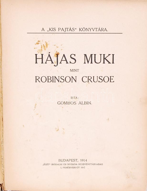 Gombos Albin: Hájas Muki mint Robinson Crusoe. Bp., 1914, "Kis Pajtás"... https://www.darabanth.com/de/177-Fernauktion/177.0/Andere-Sammelgebiete/Bucher-Sonstige-Raritaten~200042/Gombos-Albin-Hajas-Muki-mint-Robinson-Crusoe-Bp-1914-Kis-Pajtas-Gyermeklap-Festett-egeszv~II606937