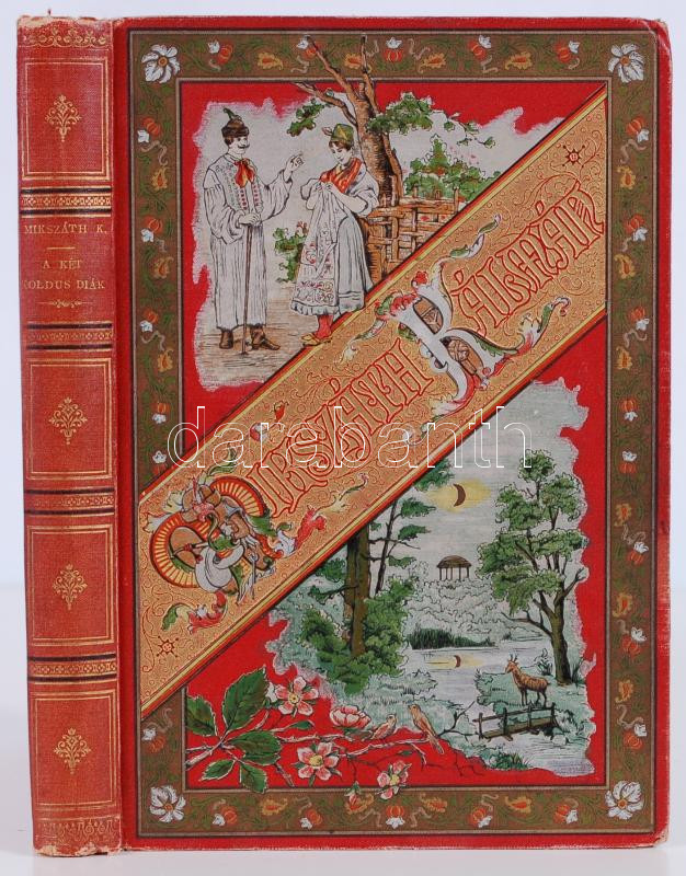 Mikszáth Kálmán: A két koldusdiák Bp., 1894. Révai. Kiadói, díszes, illusztrált, festett, Gottermayer egészvászon kötésben, körben festett lapszéllel. hátul kis folt