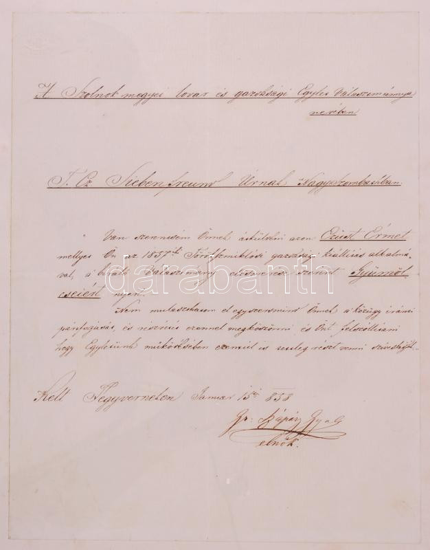 1858 gróf Szapáry Gyula későbbi miniszterelnök által aláírt levél a Szolnok megyei lovas és gazdasági egylet nevében, a Törökszentmiklósi Gazdasági Kiállításon adományozott kertészeti elismerésről. Kartonra kasírozva.