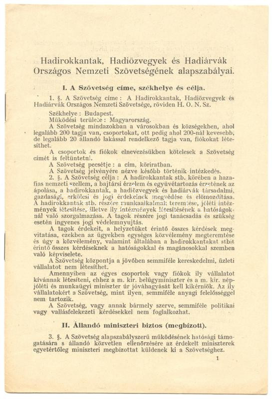 Beschreibung: 1929 Hadirokkantak, Hadiözvegyek és Hadiárvák Országos Nemzeti Szövetségének alapszabályai, 12p
