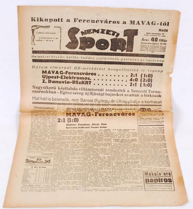 1944. dec. 18. Nemzeti Sport címlapja "Kikapott a Ferencváros a MAVAG-... https://www.darabanth.com/de/177-Fernauktion/177.0/Andere-Sammelgebiete/Drucksachen~200025/1944-dec-18-Nemzeti-Sport-cimlapja-Kikapott-a-Ferencvaros-a-MAVAG-tol-hirrel~II605630