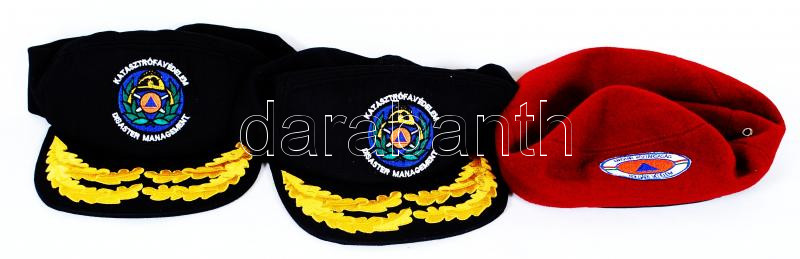 Beschreibung: 3 db sapka: 2 db "katasztrófa védelem" és egy "polgári védelem" feliratú sapkák
