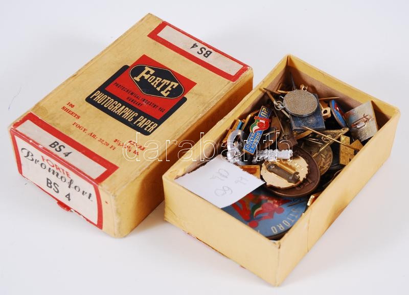 Beschreibung: Cca 60db-os tartalmas jelvény- és kitűzőgyűjtemény régi Forte fotópapíros dobozban