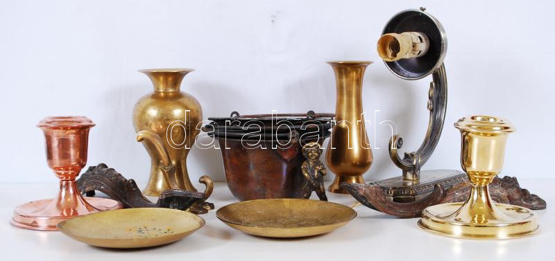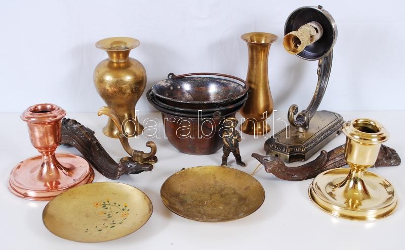 Beschreibung: Doboznyi vegyes réz tétel: gyertyatartók, vázák, tálkák, elektromos falikar, mini bográcsok stb