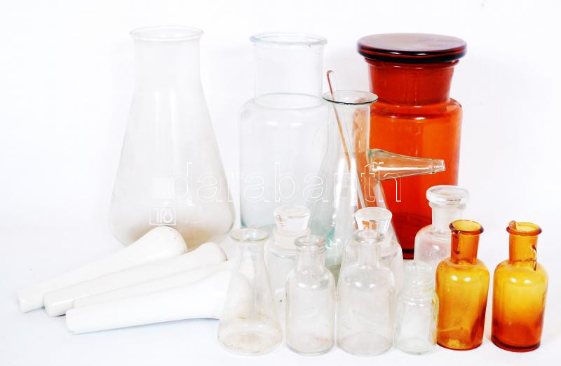Beschreibung: Gyógyszerész kellékek: Üvege fiolák, laboratóriumi üvegek, porcelán török, néhány sérült