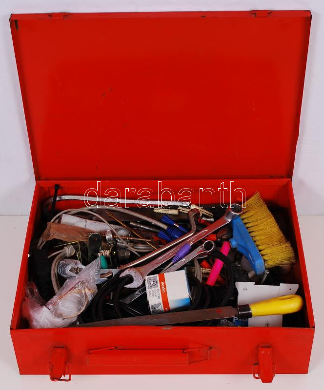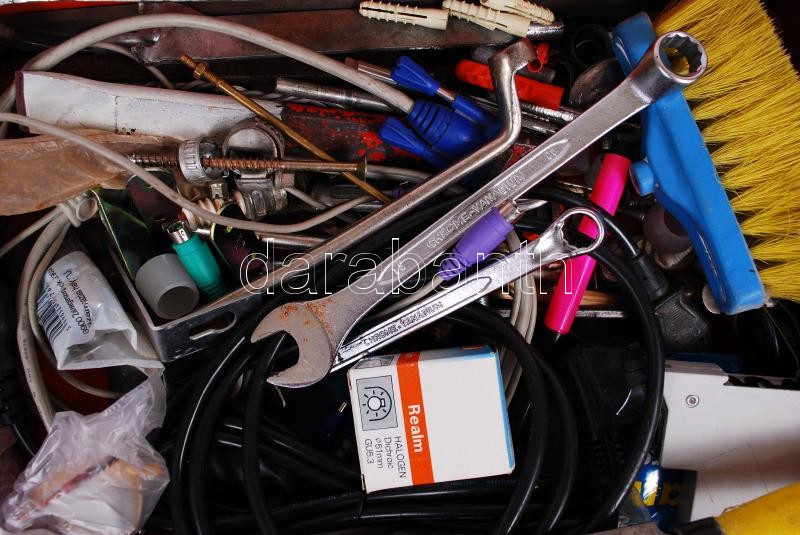 Hatalmas barkács felszerelés, Csigafúrók vídia, csavarok, saruk, tiplik, villáskulcsok, reszelők, metszők, számítógépkábel, kormányzár kulccsal, jó fémdobozban