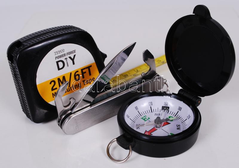 Beschreibung: Mérőszalag, iránytű és egy multifunkciós zsebkés /