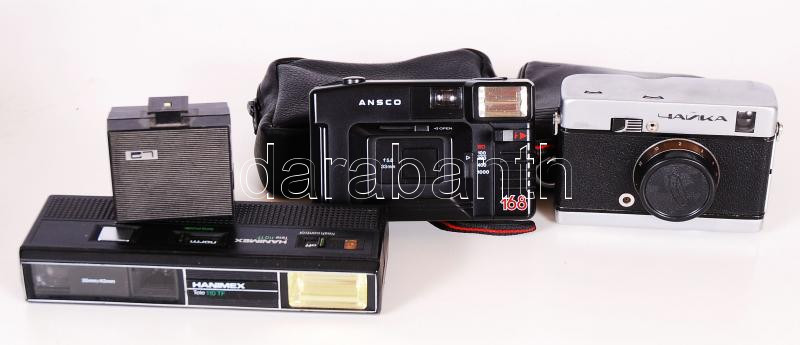 3db fényképezőgép: Hanimex Tele 110 TF, Ansco 168, Csajka (Chaika) és egy L2 vaku /