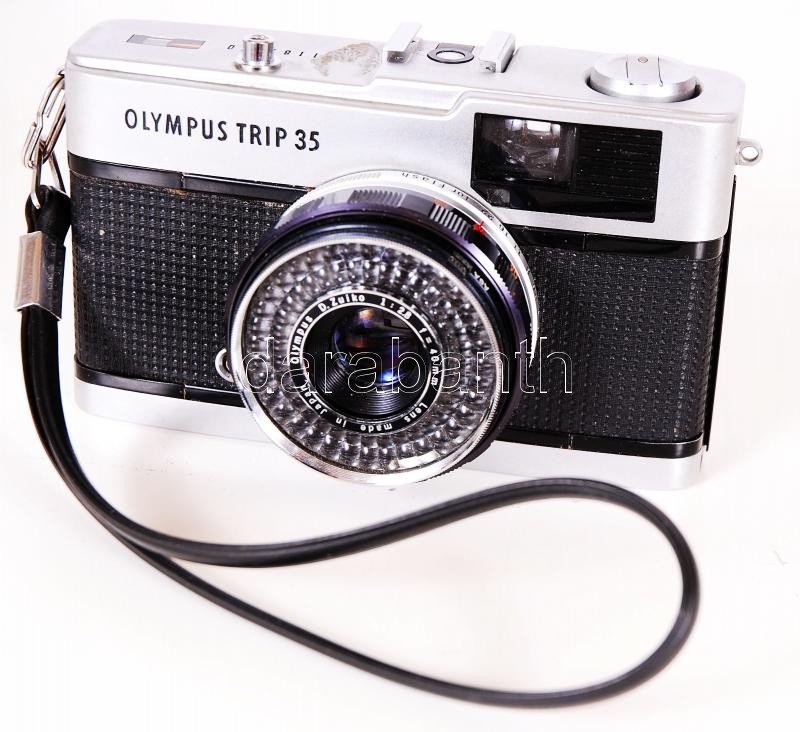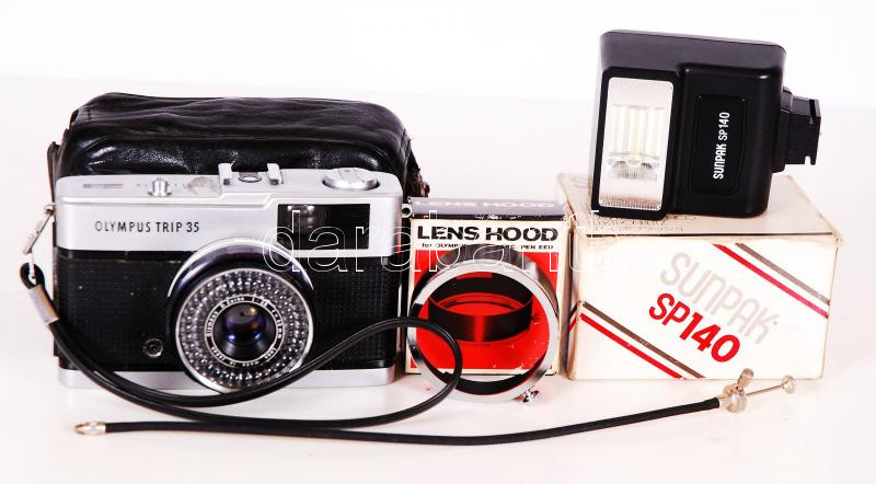 Olympus Trip 35 fényképezőgép eredeti, bőr tokjában Sunpak SP 140 vakuval, napellenzővel és kioldóval /