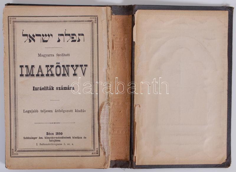 1890 Imakönyv. Héber-magyar, rossz állapotban, Jó egészvászon kötéstáb... https://www.darabanth.com/de/177-Fernauktion/177.0/Andere-Sammelgebiete/Judaica~200021/1890-Imakonyv-Heber-magyar-rossz-allapotban-Jo-egeszvaszon-kotestablaval-prayerbook~II620085