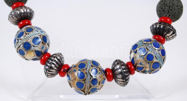 Nagyméretű lánc kézzel készített afgán szemekkel, vörös korallal, olajzöld lávakővel, fém gyöngyökkel és ezüst (Ag) szerelékkel /
