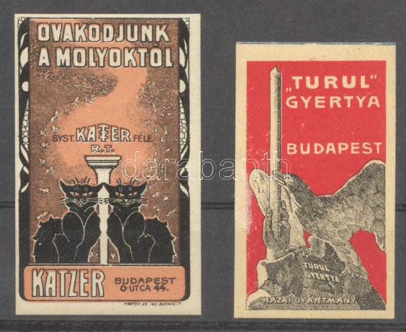 Beschreibung: Óvakodjunk a Molyoktól + Turul gyertya reklám levélzárók (az egyiken betapadásnyom)