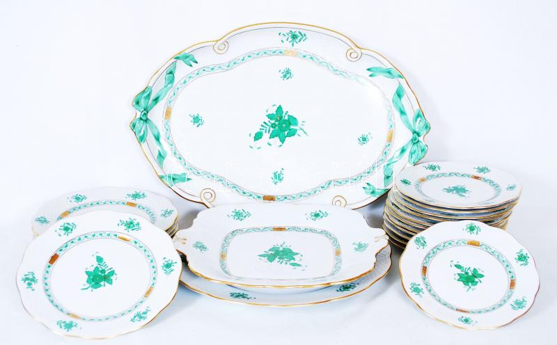 Beschreibung: 21 darabos kézzel festett és aranyozott, sorszámozott, Apponyi vert-mintás, jelzett Herendi porcelán tányér- és tálkészlet hibátlan állapotban: 12db süteményes- és 6db kistányér, 1db pecsenyés, 1db süteményes és 1db kompótos tál /