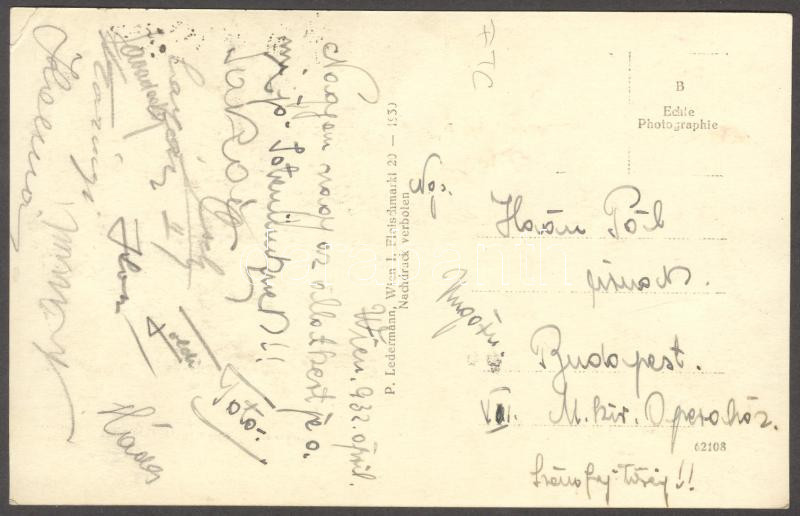 Beschreibung: 1932 Az FTC futballistáinak aláírása Bécsből hazaküldött képeslapon: Toldi, Takács, Cseh, stb.