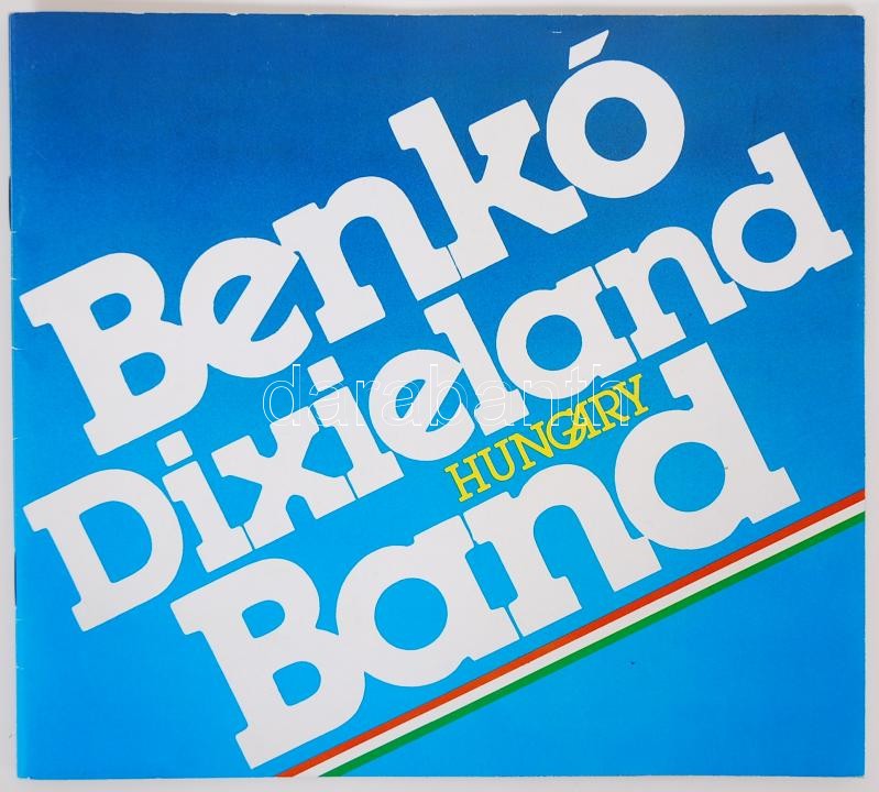 cca 1990 Benkó Dixieland Band zenekart ismertető angol nyelvű prospektus, továbbá Benkó Sándor és más tagok aláírása, és egy fotó Járay Jánosról (dobok, 1963-2000)