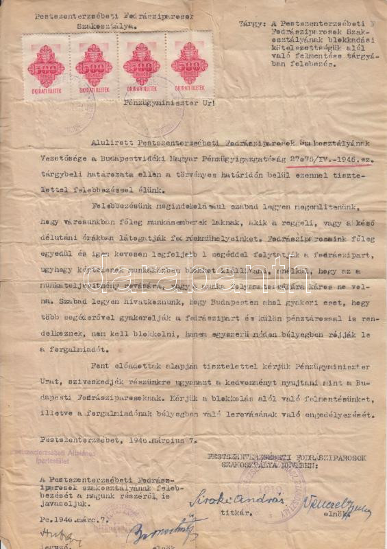1946 Fellebbezés 54x500P okirati illetékbélyeggel https://www.darabanth.com/de/177-Fernauktion/177.0/Andere-Sammelgebiete/Stempelmarken~200013/1946-Fellebbezes-54x500P-okirati-illetekbelyeggel~II621152