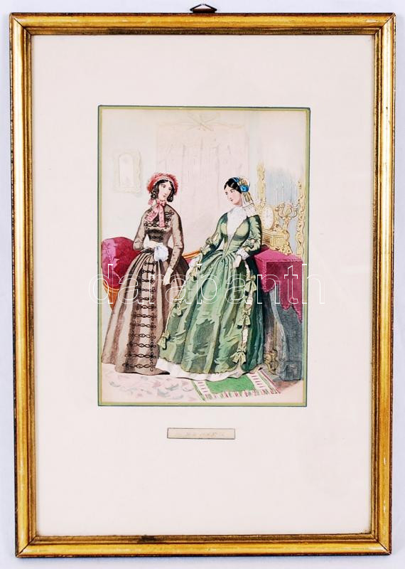 Beschreibung: 1846 Divatkép. Színezett rézkarc, üvegezett keretben, 37,5x26,5cm