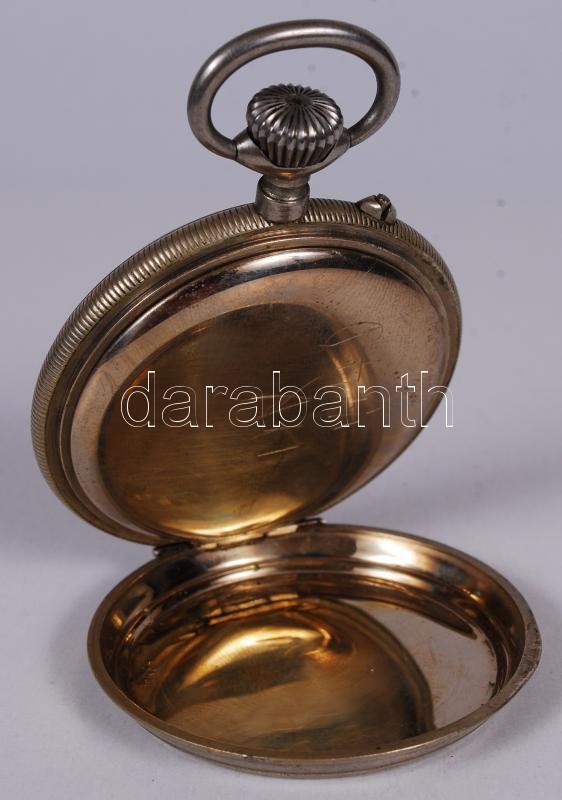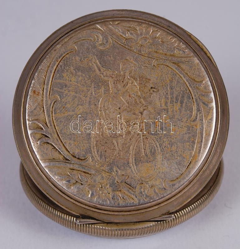 cca 1900 Supérieur zsebóra duplasoros, hibátlan porcelán számlappal, másodpercmutatóval, hátlapján kerékpározó hölgy szecessziós, domborműves portréja, jól jár /