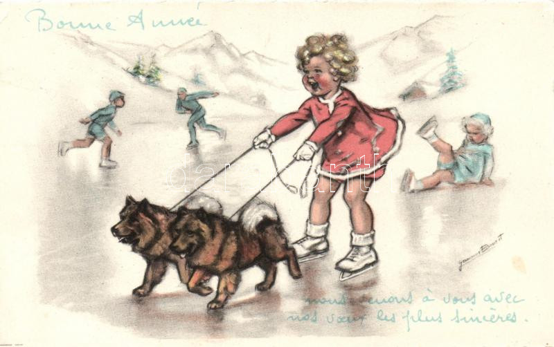 Beschreibung: New Year, ice skater girl with dogs, artist signed (EK)