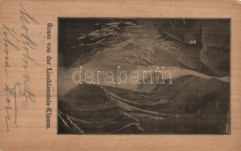 1899 Liechtensteinklamm, wooden card https://www.darabanth.com/de/177-Fernauktion/177.0/Ansichtskarten/Osterreich~3300043/1899-Liechtensteinklamm-wooden-card~II616300