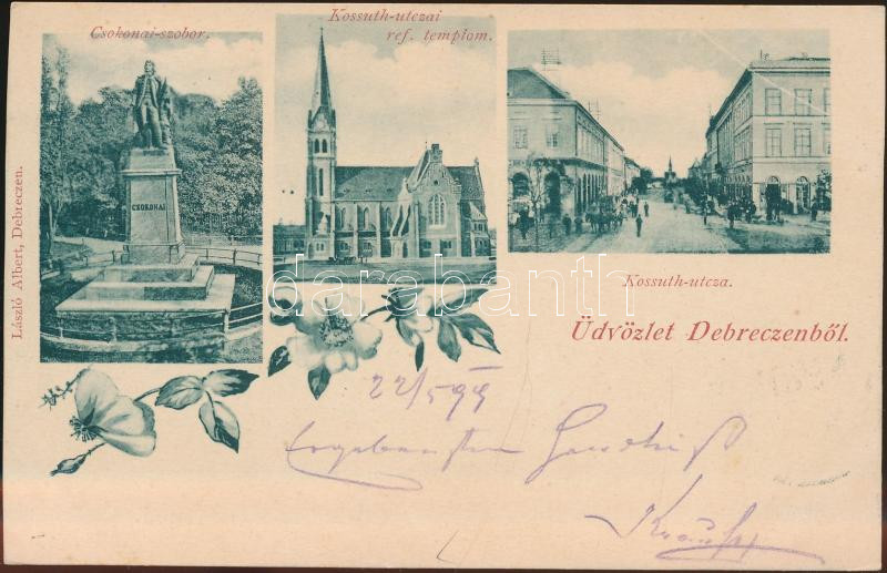 1899 Debrecen Kossuth utca, református templom, Csokonai szobor https://www.darabanth.com/de/177-Fernauktion/177.0/Ansichtskarten/Ungarn~3300006/1899-Debrecen-Kossuth-utca-reformatus-templom-Csokonai-szobor~II624115